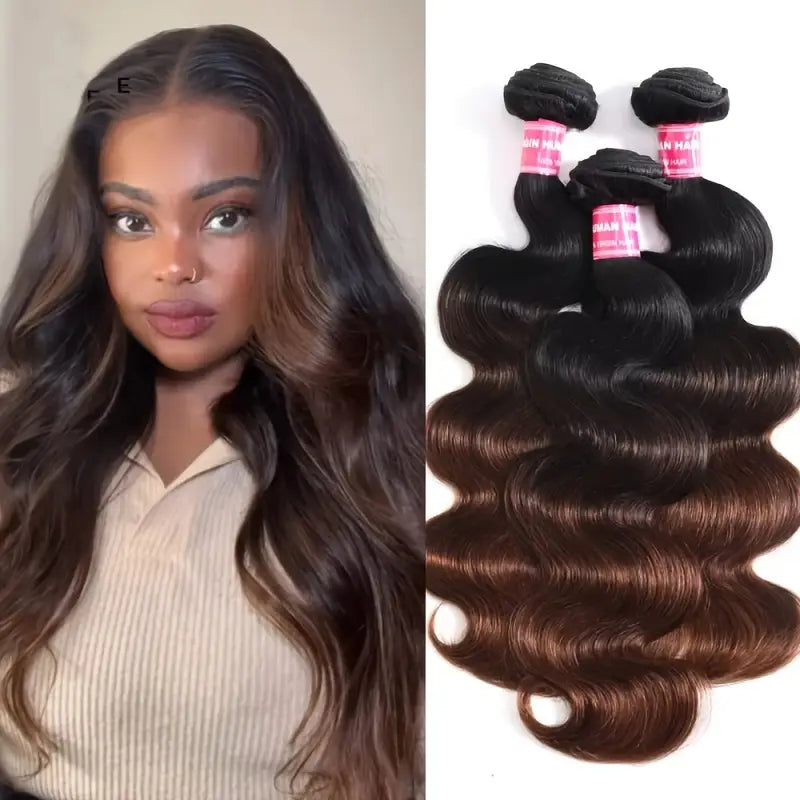 3pcs Klaiyi Dark Root Ombre Brown Body Wave Human Hair Bundles - 100% Brazilian Human Hair, Soft & Thick, 8-26 Inch Mix, No Shedding, Tangle-Free, Long-Lasting for Styling, Washing & Perming. NK299941 T